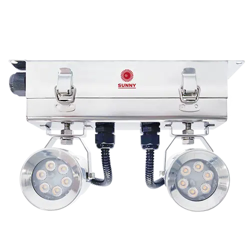 Remote lamp surface ceiling type: RST Surface Ceiling Type Double Lamp Series, the lamp body is made of Stainless Steel Grade 304, the level of protection against dust and water, Type IP66. The product can be installed in areas that are at risk in being exposed to dust and water spray. The ramp body will not cause rust and dust and water spray cannot get into the lamp which will help prevent damage from occurring. The lamp can adjust the direction of the beam in both the left, right and tilt angles. The left, right can be adjusted about 180 degrees and 45 degrees for the tilt angle in the form of actual installation. The lamp works with LED bulb LED MR16 GU5.3 by receiving electric power from emergency lighting control system. Central battery control unit of 12Vdc, 24Vdc and 220Vac in case of power failure, will provide emergency lighting for escape.
