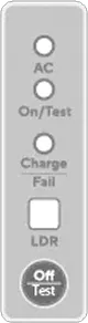 • ไฟสีแดงกะพริบ 3 ครั้ง ทุก ๆ 15 วินาที : Battery Fail เมื่อระบบได้ทําการทดสอบแบตเตอรี่อัตโนมัติ (Auto Test) โคมไฟสํารองไฟแสงสว่างได้น้อยกว่า 120 นาที หรือน้อยกว่าเวลาที่สั่งทดสอบด้วยรีโมท