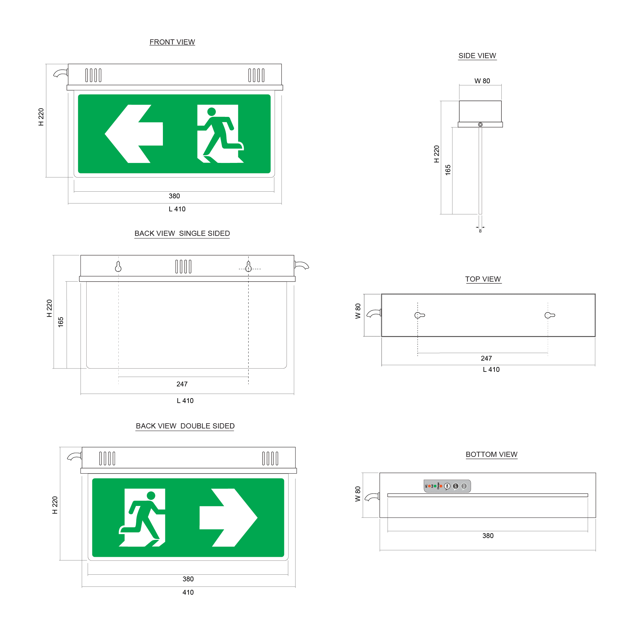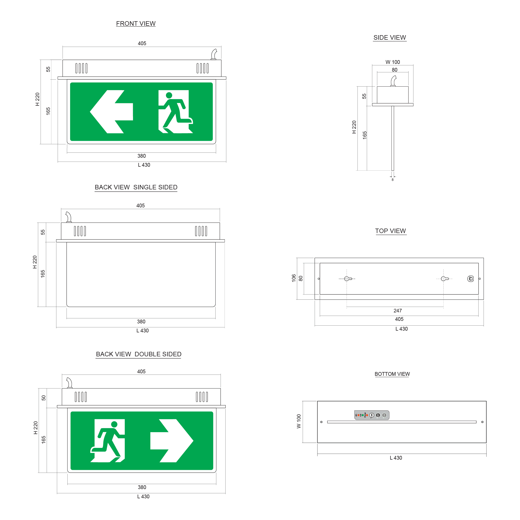 The SLS1-10LED (Single sided / Double sided) emergency exit sign can be ceiling mounted and surface mounted.