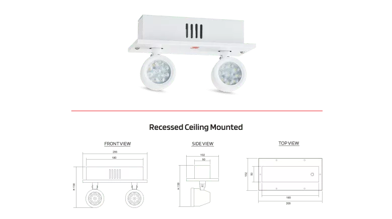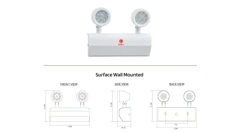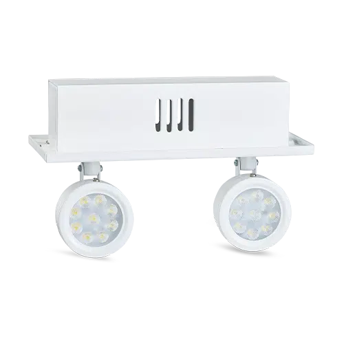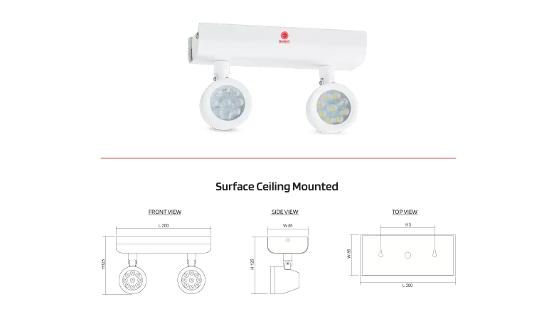 ไฟฉุกเฉิน Remote Lamp ชนิดติดตั้งแบบ ฝังฝ้า/ติดลอย/ติดผนัง รุ่น RCD Series – Double Lamp ตัวโคมสามารถปรับทิศทางของลำแสงได้ทั้งแบบซ้าย, ขวา และมุมเงย โดยทางซ้าย, ขวา สามารถปรับได้ประมาณ 180 องศา 45 องศา ของมุมก้มเงยในลักษณะการติดตั้งใช้งานจริง การใช้งานทำงานร่วมกับหลอด LED MR16 Gu5.3 โดยรับพลังงานไฟฟ้าจากตู้ควบคุมระบบไฟฉุกเฉิน Central Battery Systems กรณีไฟฟ้าดับจะให้แสงสว่างฉุกเฉินเพื่อการหนีภัย
